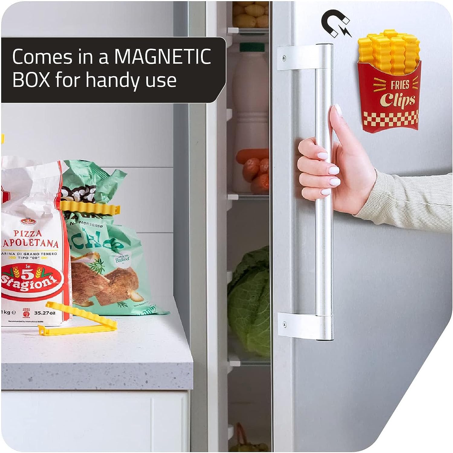 Introducing our 12-piece magnetic french fries food sealing clips, designed to keep your food fresh and organized. Made with strong magnets, these clips securely seal bags and are perfect for your favorite snack. Say goodbye to stale fries with our innovative sealing clips.